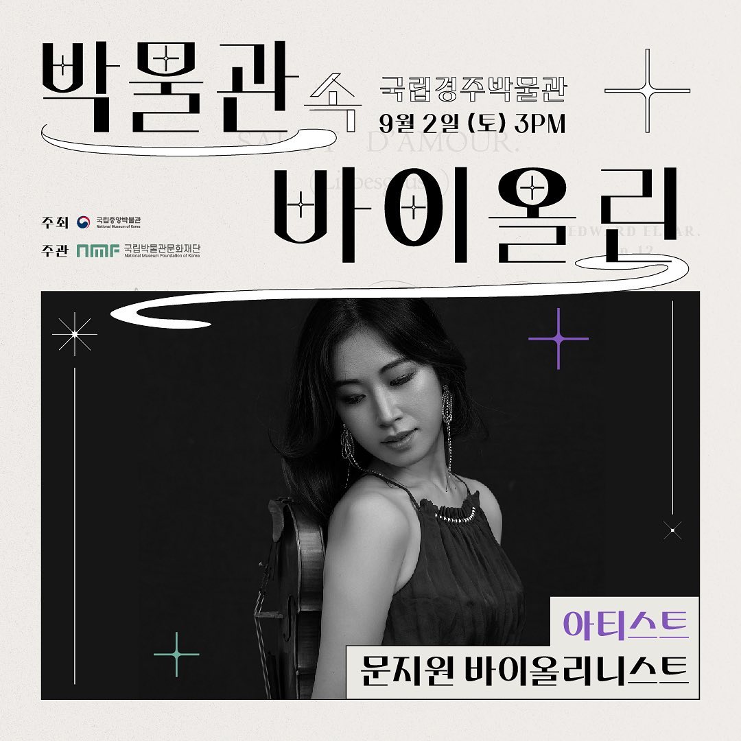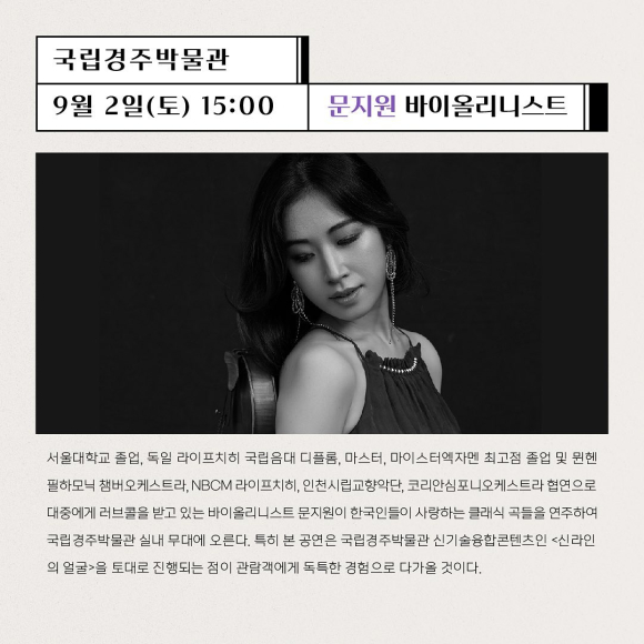 - 공연장소|국립경주박물관 야외마당- 공연일시| 2023. 9. 2. sat 15:00- 아티스트| 문지원 바이올리니스트- 소개전시| 신기술융합콘텐츠 <신라의 얼굴들>