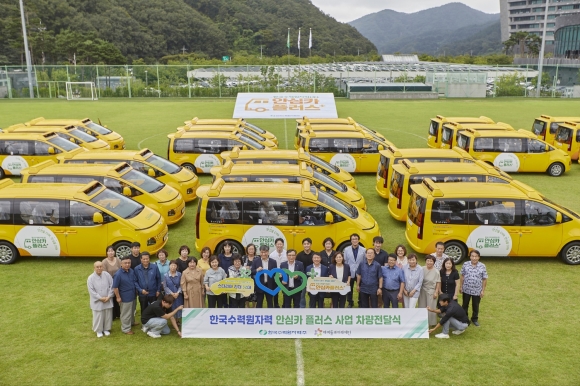 [오마이경주/경주시민신문=김경미기자] 한국수력원자력(사장 황주호, 이하 한수원)이 28일 경주 본사에서 ‘안심카 플러스’ 차량 전달식을 열고, 전국 아동복지시설에 어린이 통학용 승합차 32대를 전달했다.