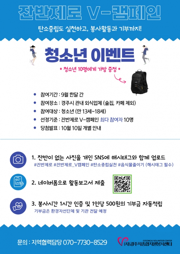 [오마이경주/경주시민신문=김경미기자] (사)경주시종합자원봉사센터(이사장 정재윤, 이하 센터)는 새학기를 맞아 ‘잔반제로 V-캠페인’ 청소년 가방증정 이벤트를 9월 한달 간 진행한다고 밝혔다.