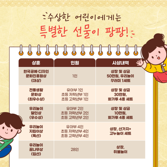 - 공모주제 : 우리놀이 한마당 또는 우리놀이터, 학교, 가정에서 즐겨본 전통놀이 체험 후기