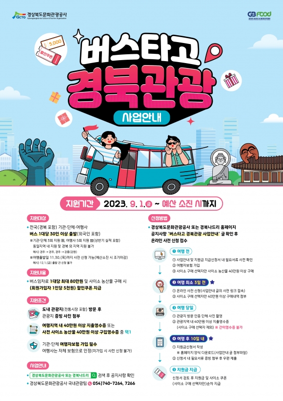 자세한 참여 안내와 지원금신청서 양식은 경상북도문화관광공사 홈페이지(http://www.gtc.co.kr) 및 경북나드리(https://tour.gb.go.kr) 홈페이지 공지사항 ‘버스타고 경북관광’ 사업안내 게시글을 통해 확인할 수 있다.