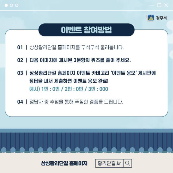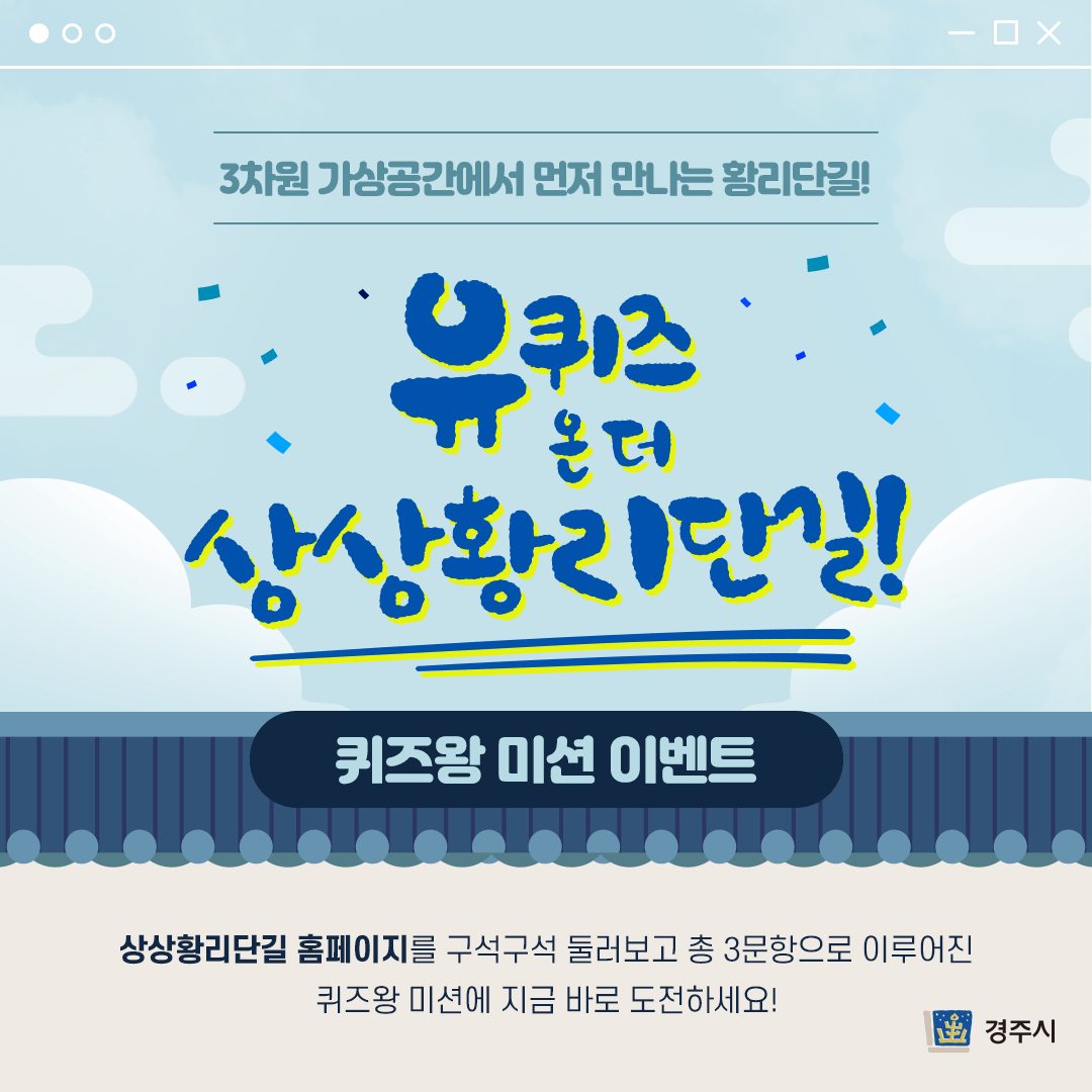 상상황리단길 홈페이지를 구석구석 둘러보고 퀴즈왕 미션에 도전하세요!