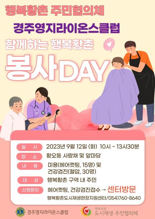 행복황촌 에서 경주영지라이온스클럽의 #미용봉사 및 건강검진 자원봉사가 있습니다.