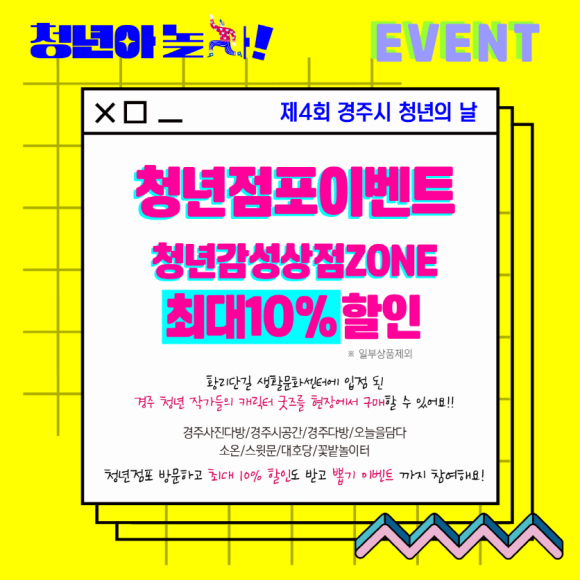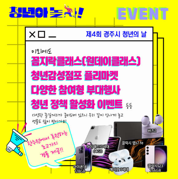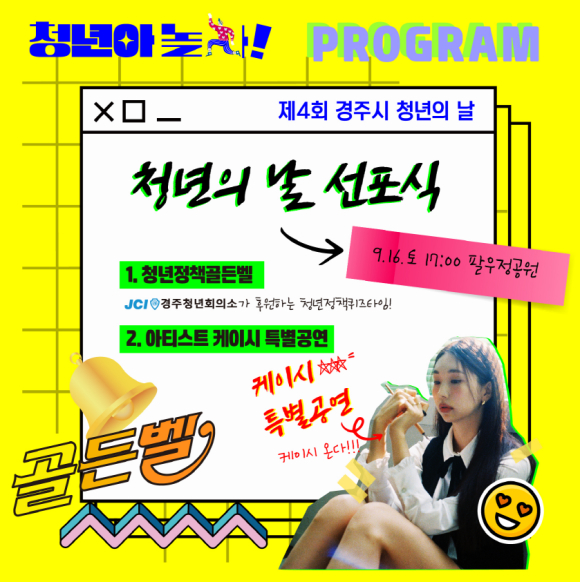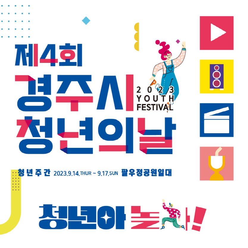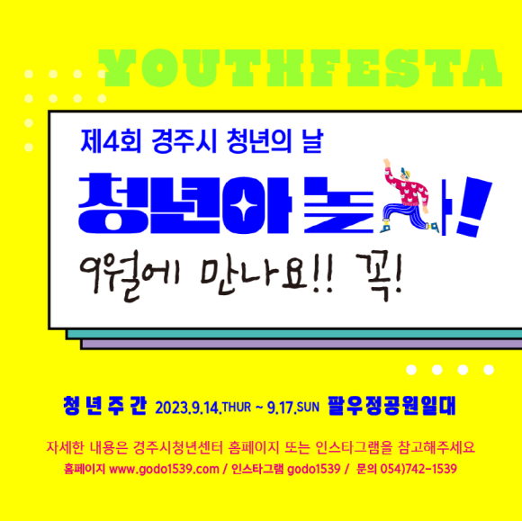 2023년 9월 14일 ~ 17일에 팔우정공원 일대에서 진행되는 경주시 청년의 날 행사입니다.