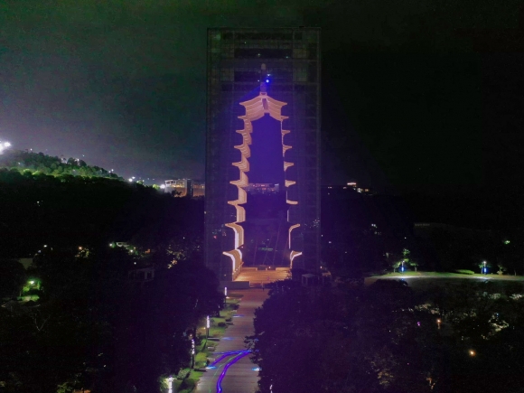 타워 전망층에 설치된 레이저는 초록색과 보라색의 빛을 상하좌우로 비추며 경주엑스포대공원의 밤을 빛으로 꾸미고, 타워 앞 주작대로와 왕경 숲을 신비로운 빛의 공간으로 바꾸어 놓는다.