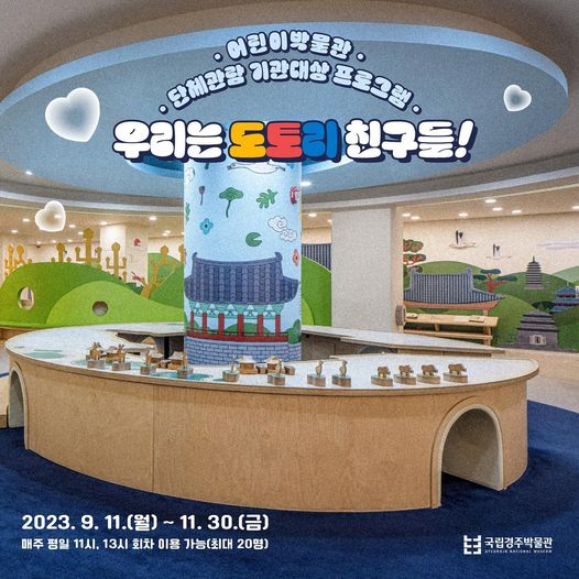 - 운영일시: 2023. 9. 11.(월) ~ 11. 30.(금) / 매주 평일 11:00~12:00, 13:00~14:00- 운영장소: 국립경주박물관 어린이박물관- 운영대상: 어린이박물관 단체관람을 희망하는 어린이집, 유치원, 초등학교 (보호자 포함 최소 15명, 최대 20명)- 참여방법: 온라인 사전 예약 후 방문