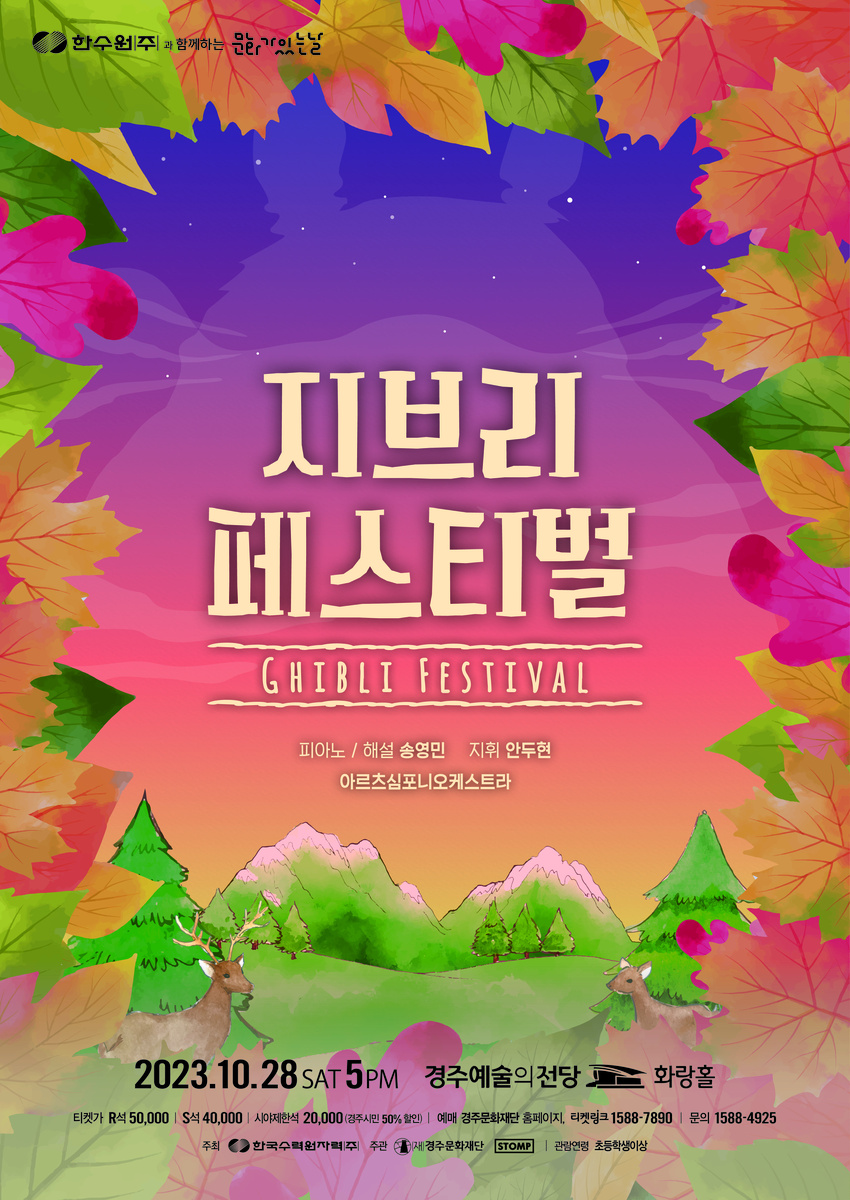 [오마이경주/경주시민신문=김경미기자] 한국수력원자력(주)(이하 한수원)이 주최하고 (재)경주문화재단(이하 재단)이 주관하는 ‘한수원과 함께하는 문화가 있는 날 <지브리 페스티벌>’ 공연이 오는 10월 28일 토요일 17시 경주예술의전당 화랑홀에서 막을 올린다.