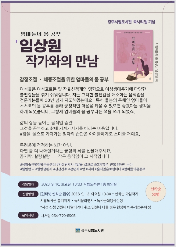 [오마이경주/경주시민신문=김경미기자] 경주시립도서관이 ‘엄마들의 몸 공부’ 저자 임상원 작가 초청 북토크를 개최한다.