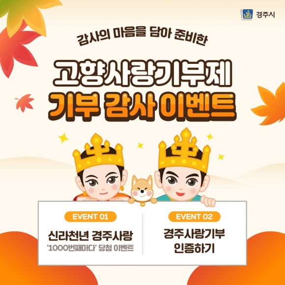 이벤트는 신라천년 경주사랑 ‘1000번째마다’ 당첨 이벤트와 경주사랑기부 인증하기 총 2가지다.