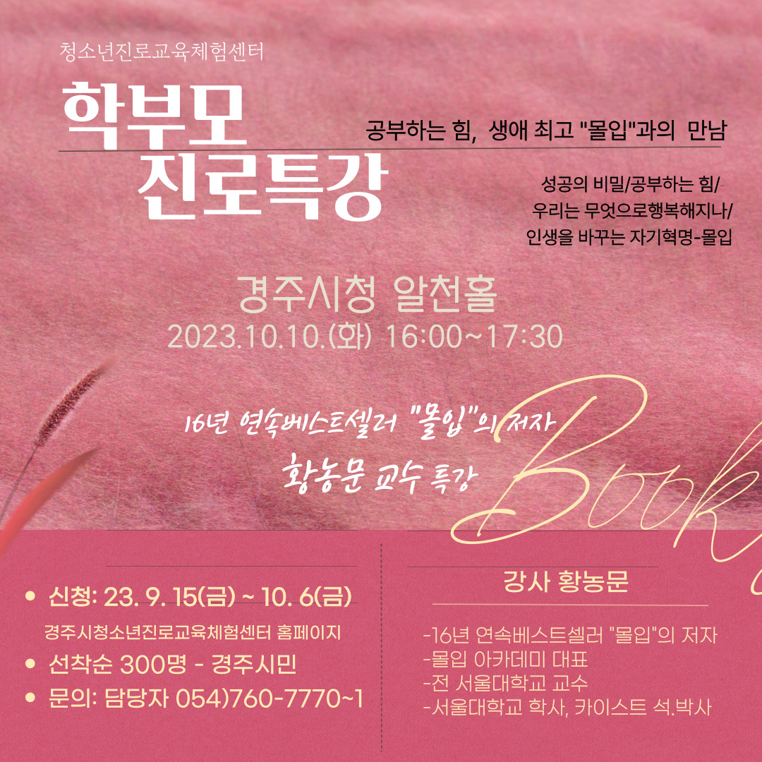 - 강 사 : 전 서울대학교 교수 황농문강사- 일 시 : 2023. 10. 10 (화) 16:00~17:30- 장 소 : 경주시청 알천홀- 대 상 : 경주시민 (선착순 300명)- 신 청 : 2023.09.159금) ~ 10.6(금)- 문 의 : 054-760-7770~1