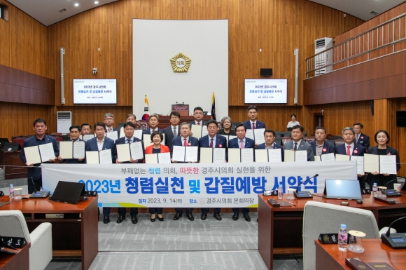 [오마이경주/경주시민신문=김경미기자] 경주시의회(의장 이철우)는 14일 제277회 임시회 폐회 후 전체 의원 및 사무국 직원을 대상으로 ‘청렴서약식’ 및 ‘청렴 및 갑질예방 교육’을 실시했다.