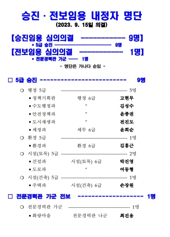 [오마이경주/경주시민신문=김경미기자] 경주시, 승진·전보임용 내정자 명단(2023. 9. 15일 의결)