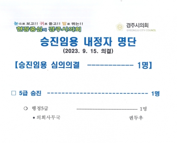 경주시의회, 승진임용 내정자 명단(2023. 9. 15 의결)