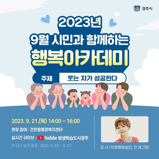 - 주제 : 웃는 자가 성공한다- 일시 : 2023. 9. 21.(목) 14:00 ~ 16:00- 현장 참여 : 건천읍행정복지센터- 실시간 라이브 : '평생학습도시' 유튜브 채널