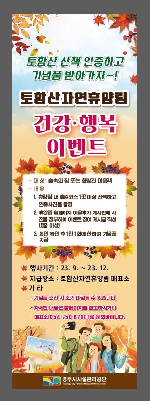 [오마이경주/경주시민신문=김경미기자] 경주시시설관리공단(이사장 정태룡)은 토함산자연휴양림을 이용하는 고객에게 감사의 마음을 담아 오는 25일부터 금년 연말까지 건강. 행복 이벤트를 시행한다고 밝혔다.