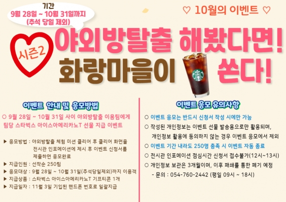 [오마이경주/경주시민신문=김경미기자] 경주화랑마을이 추석을 맞아 ‘야외방탈출’ 게임 참여자 중 미션을 성공한 팀에게 팀당 1개씩 최대 250개 커피쿠폰을 증정하는 이벤트를 실시한다.