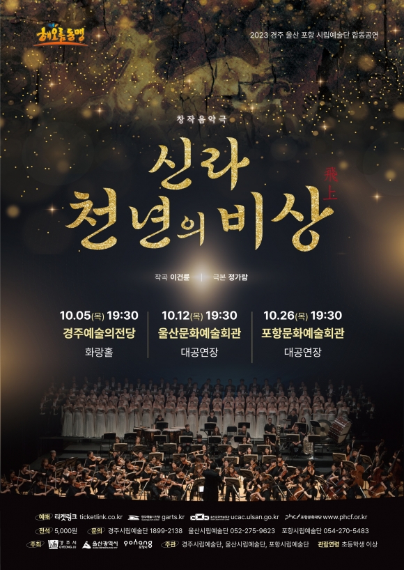 해오름동맹시립예술단 합동공연 ‘신라 천년의 비상’은 전석 5000원이며, 예매는 경주예술의전당 홈페이지 및 티켓링크에서 가능하다.