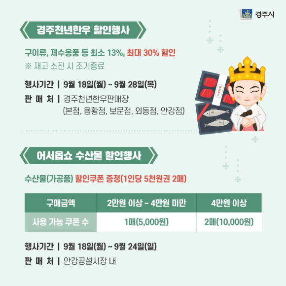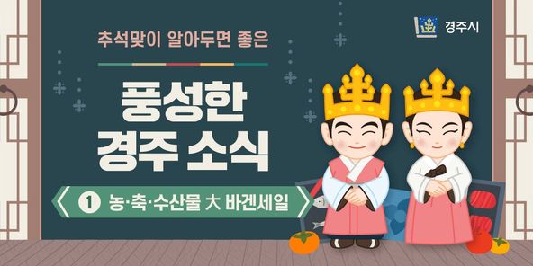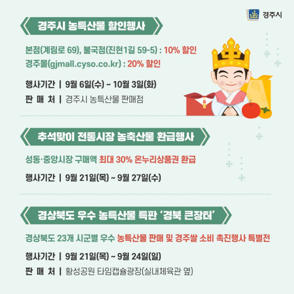 - 제1탄 농·축·수산물 大 바겐세일 편- 경주시 농특산물 할인행사- 추석맞이 전통시장 농축산물 환급행사- 경상북도 우수 농특산물 특판 '경북 큰장터'- 경주천년한우 할인행사- 어소옵쇼 수산물 할인행사