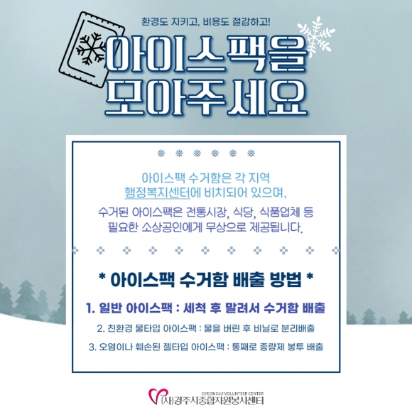 이번 캠페인은 추석 명절이 지난 후 쌓여있는 아이스팩을 수거하여 환경도 보호하고 비용도 절감하자는 취지로, SNS 홍보를 통해 올바른 아이스팩 배출 방법과 경주 내 아이스팩 수거함 위치 등을 알리는 활동으로 진행된다.