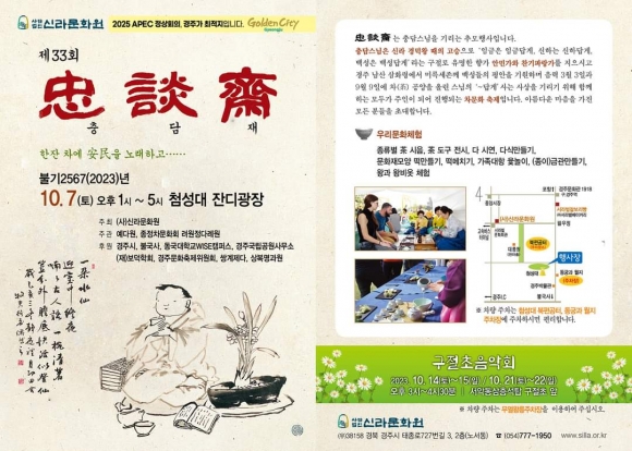 [오마이경주/경주시민신문=김경미기자] (사)신라문화원은 7일(토) 오후 1시 첨성대 광장에서 한 잔 차에 안민(安民)을 노래하던 충담스님의 뜻을 기리는 ‘제33회 충담재’를 개최한다.