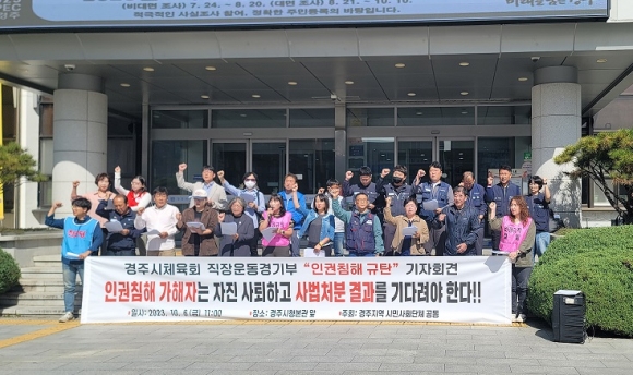 [오마이경주/경주시민신문기자] 경주 시민사회단체가 6일 기자회견에서 직장 내 괴롭힘 의혹이 제기된 경주시체육회장에 대해 자진 사퇴를 촉구했다.