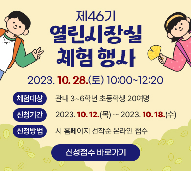 - 참여대상 : 관내 초등학생(3~6학년) 20명(보호자 동반시, 체험신청하실 시 [신청 동기 부분]에 학부모 동행 여부 적어 주세요)