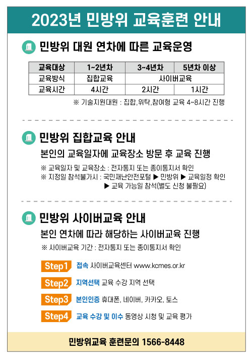 사이버교육 : 민방위 3~4년차 2시간, 5년차 이상 1시간