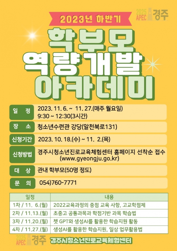 [오마이경주/경주시민신문=김경미기자] 경주시 청소년진로교육체험센터는 다음 달 매주 월요일마다 하반기 학부모 역량개발 아카데미를 청소년수련관 강당에서 운영한다.