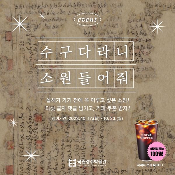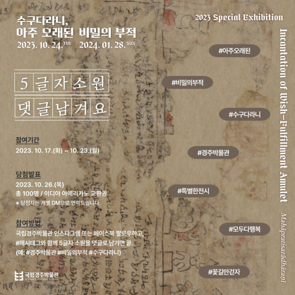 #참여방법국립경주박물관 인스타그램(@gnmuseum) 또는 페이스북(kgjnm) 팔로우 하고,#해시태그와 함께 5글자 소원 댓글 남기기. 끝.(예: #비밀의부적 #특별전대박 #꽃길만걷자)⠀#참여기간2023. 10. 17.(화)~10. 23.(월)⠀#당첨발표2023. 10. 26.(목)총 100명 / 이디야 아메리카노 교환권※ 당첨자는 개별 DM으로 연락드립니다.