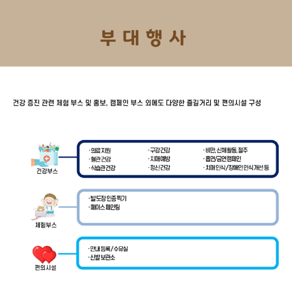 - 주요내용 : 개회식, 맨발건강걷기, 힐링음악회, 건강체험 한마당 등