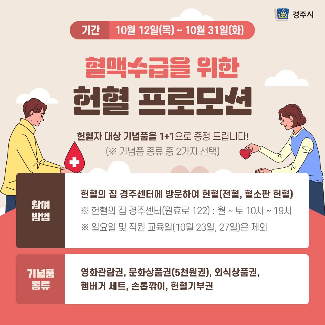 - 기간 : 10월 12일(목) ~ 10월 31일(화)- 참여방법 : 헌혈의 집 경주센터에 방문하여 헌혈 (전혈, 혈소판 헌혈)※ 헌혈의 집 경주센터(원효로 122) : 월 ~ 토 10시 ~ 19시※ 일요일 및 직원 교육일(10월 23일, 27일)은 제외