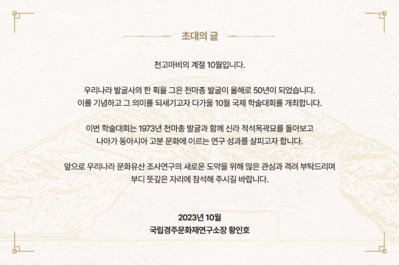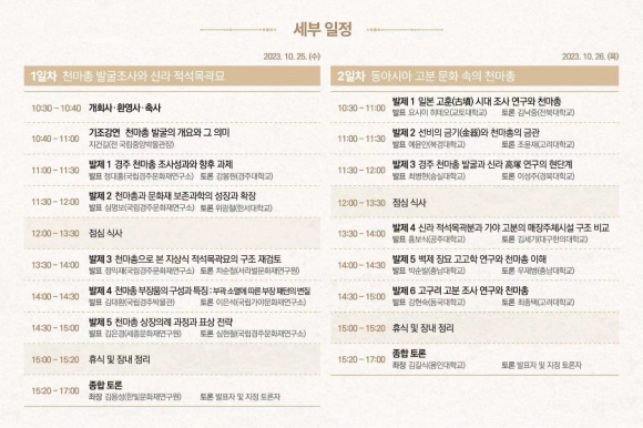- 일 시 : 2023.10. 25. (수)-2023. 10. 26. (목)- 장 소 : 경주 교원 드림센터 대강의실 경상북도 경주시 보문로280-34- 문 의 : 국립경주문화재연구소 ☎ 054-622-1720