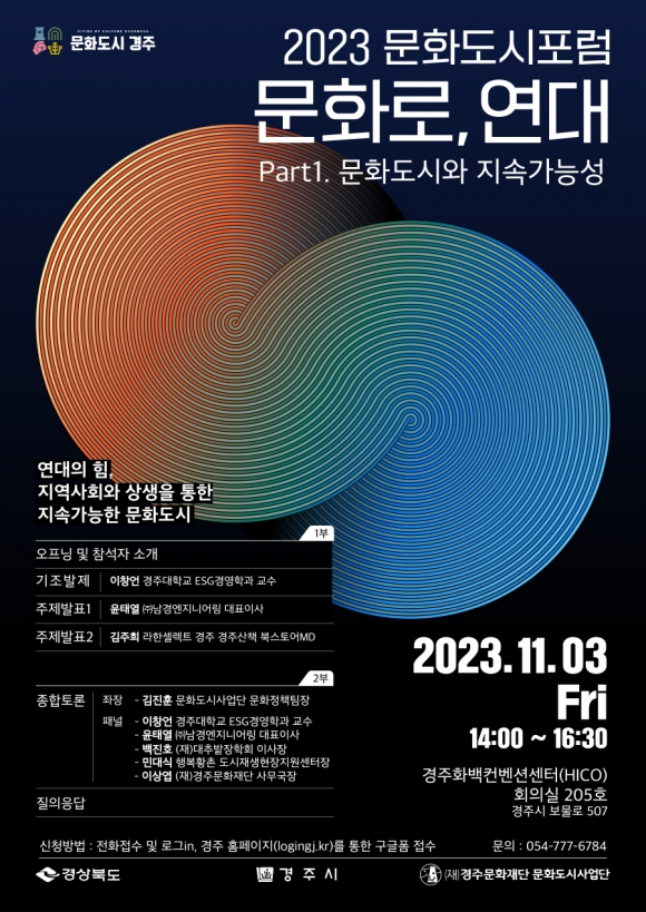 이번 경주 문화도시포럼 ‘문화로, 연대’는 총 3회로 구성되어 있으며, 추후 ‘part2. 문화도시와 로컬크리에이터’, ‘part3. 문화도시와 지역연대’ 내용을 진행할 예정이다.