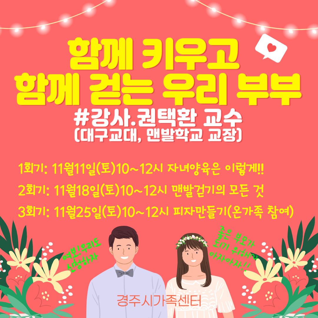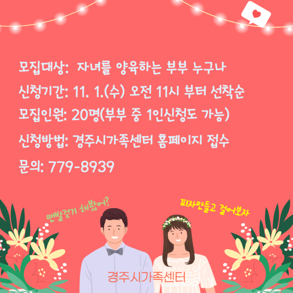-신청대상 : 경주시에 자녀를 양육하는 부부 누구나- 신청기간 : 11. 1.(수) 부터 선착순- 모집인원 : 20명(부부 또는 부부 중 1인 신청 가능)- 신청방법 : 경주시가족센터 홈페이지 접수- 문 의 : 054)779-8939