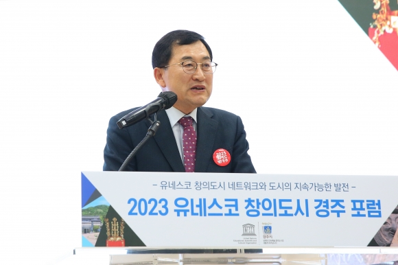 | ↑↑ 주낙영 시장이 2일 유네스코 창의도시 경주포럼식에 참석해 인사말을 하고 있다 |