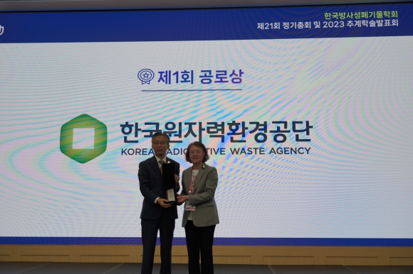 | ↑↑ 한국원자력환경공단 공로상 수상(왼쪽부터 조성돈 한국원자력환경공단 이사장, 강문자 한국방사성폐기물학회장) |