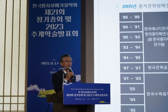 | ↑↑ 한국방사성폐기물학회 2023 추계학술발표회에서 조성돈 한국원자력환경공단 이사장이 기조강연을 하고있다 |