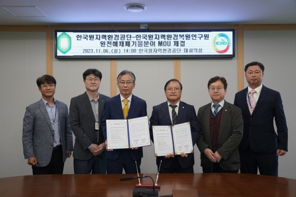 [오마이경주/경주시민신문=김경미기자] 한국원자력환경공단(이사장 조성돈)은 6일 경주 본사에서 한국원자력환경복원연구원(원장 권병훈)과 상호협력을 위한 업무협정(MOU)을 체결했다.