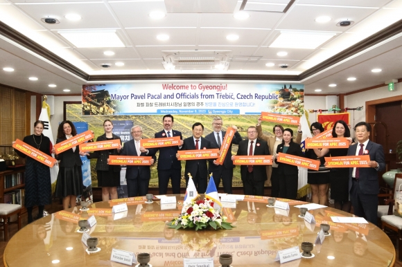 | ↑↑ 체코 트레비치시 대표단이 8일 경주시청을 방문한 자리에서 ‘2025 APEC 정상회의 경주 유치 손 푯말’을 들고 기념촬영을 하고 있다. |