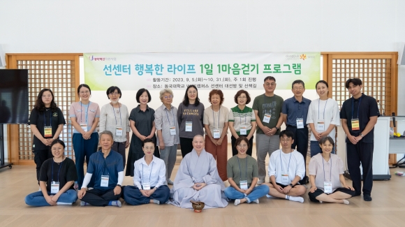 선센터 ‘행복한 라이프 1일 1마음걷기 프로그램’은 동국대 WISE캠퍼스 대학혁신지원 사업의 일환으로 경주 지역주민을 대상으로 실시되었다. 총 7회로 그 활동 내용은 신체 및 마음 균형감의 중요성을 전하는 오리엔테이션과 본 활동 매회기마다 실시하는 마음챙김 기반 회복탄력성 핵심 메시지가 담긴 화두 페이퍼 들숨날숨, 현재 순간 집중을 위한 걷기 명상, 자리리타(自利利他)를 돕는 행복발원명상, 지금-여기 마음 나누기 등으로 구성되어 진행했다.