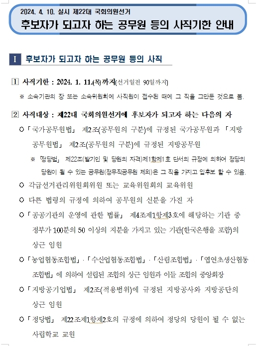 [오마이경주=경주시민신문기자] 경주시 선관위는 내년도 4월 10일 실시되는 제22대 국회의원 선거와 관련하여 '후보자 및 선거사무관계자가 되고자 하는 자의 사직기한 등'을 안내했다.
