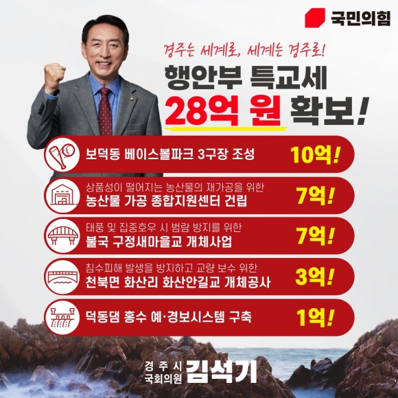 [오마이경주=경주시민신문기자] 국민의힘 김석기 최고위원. 국회의원(경주시) 에 따르면, 경주시는 지난 5 일 2023 년 하반기 행정안전부로부터 재해재난 특교세를 비롯한 현안 특교세 28억 원을 확보했다.