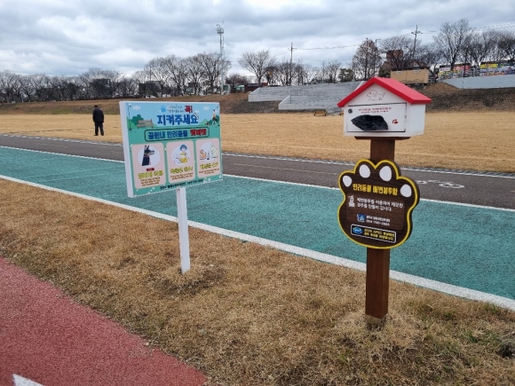 또 배변봉투함에 옆에는 맹견 입마개 및 목줄 착용, 배설물 수거 등 공원 내 반려동물 펫티켓 안내 게시판도 함께 설치했다.