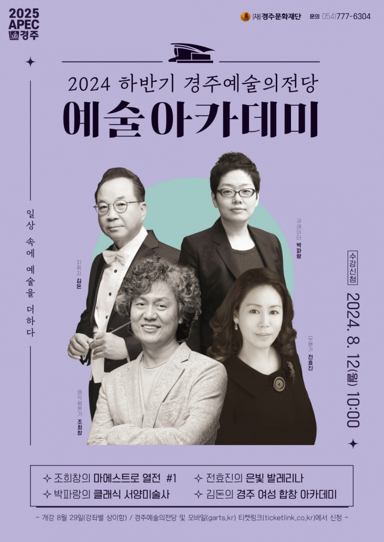 오기현 (재)경주문화재단 대표이사는 “2024 경주예술의전당 예술아카데미는 전시와 공연 감상력 증진을 돕는 연계 교육으로, 시민들이 생활 속에서 다양한 고품격 예술을 향유하는 기회가 되길 기대한다.”고 밝혔다.