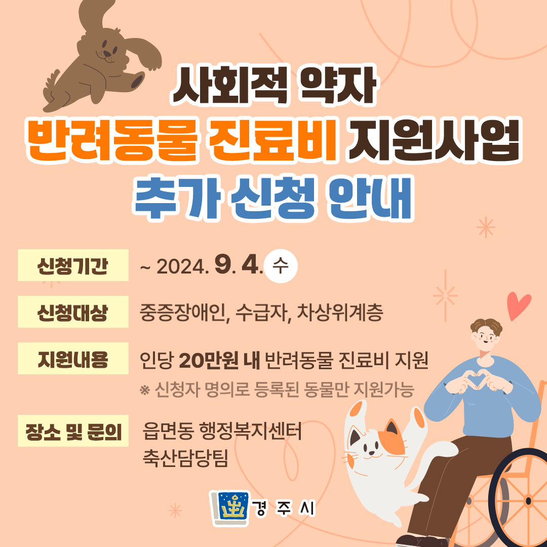 기간 내에 신청 바랍니다! ◎ 신청기간 ~ 2024. 9. 4.(수) ◎ 신청대상 중증장애인, 수급자, 차상위계층 ◎ 지원내용 인당 20만원 내 반려동물 진료비 지원 ※ 신청자 명의로 등록된 동물만 지원가능 ◎ 장소 및 문의 읍면동 행정복지센터 축산담당팀