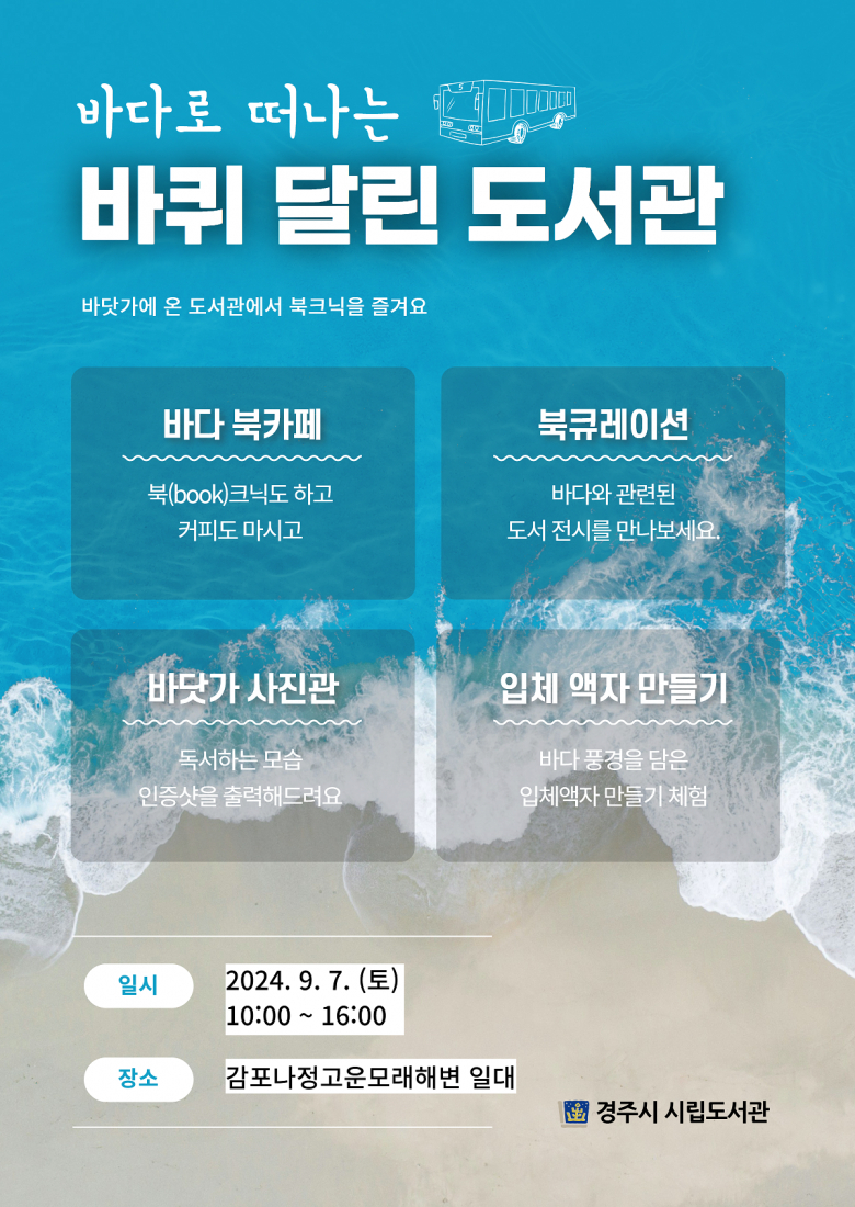 [이재영 기자] 경주시립도서관은 독서의 달을 맞이해 오는 7일 나정고운모래해변 일대에서 ‘바다로 떠나는 바퀴 달린 도서관’ 행사를 운영한다.