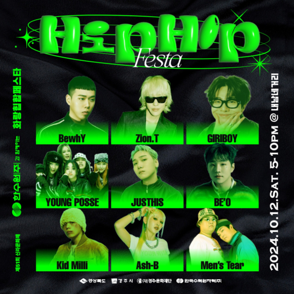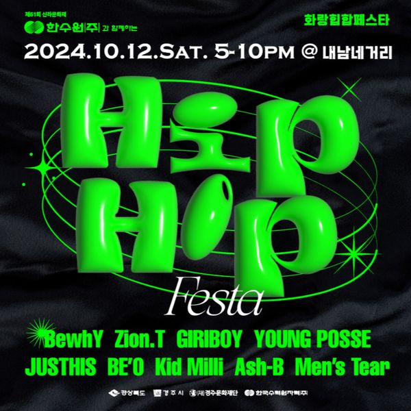 2024 제51회 신라문화제 - 화랍힙합페스타▣ 일시 : 2024. 10. 12.(토) 17시~22시▣ 장소 : 경주 내남네거리 잔디밭광장 무료입장▣ 내용 : 맨스티어, 애쉬비, 키드밀리, 비오, 저스디스, 영파씨, 기리보이, 자이언티, 비와이 순으로 진행됩니다※순서 및 공연 시간은 현장 상황 등에 따라 변동될 수 있습니다!