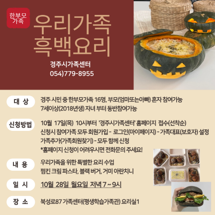 - 신청방법 : 10.17.(목) 10:00~ '경주시가족센터'홈페이지 접수(선착순)