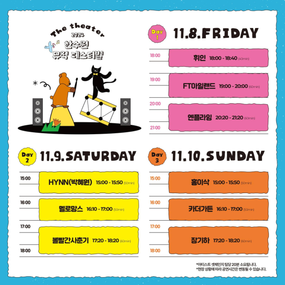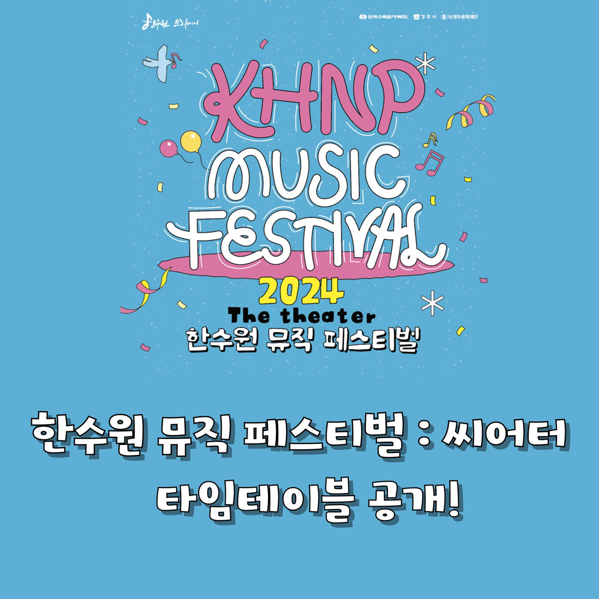 < 한수원 뮤직 페스티벌 : 씨어터 > 타임테이블 공개!!다채로운 공연과 즐길거리가 준비된 실내형 뮤직 페스티벌!!경주예술의전당에서 만나요!자세히 보기 https://vo.la/gVwYHK공연문의 : 1588-4925티켓문의 : 1588-7890