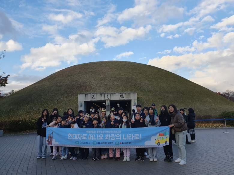 지난 23일 올해 마지막으로 진행된 ‘현대차로 떠나요 화랑의나라로’ 프로그램은 천곡지역아동센터, 우리들지역아동센터 40여명이 현대자동차(버스)를 타고 울산에서 경주 대표 역사 관광지인 불국사로 출발해 문화해설사와 함께 역사문화탐방을 한 후 점심으로 추억의 경양식 돈가스를 먹고 서악마을에서 전통문화체험 (신라금관만들기, 화랑체험,다도체험, 국궁체험, 국악공연) 등을 즐긴 후 기념선물 (찰보리빵,에코백, 거울)등을 수령하고 천마총과 첨성대를 돌아본 후 울산으로 돌아가는 일정이다.